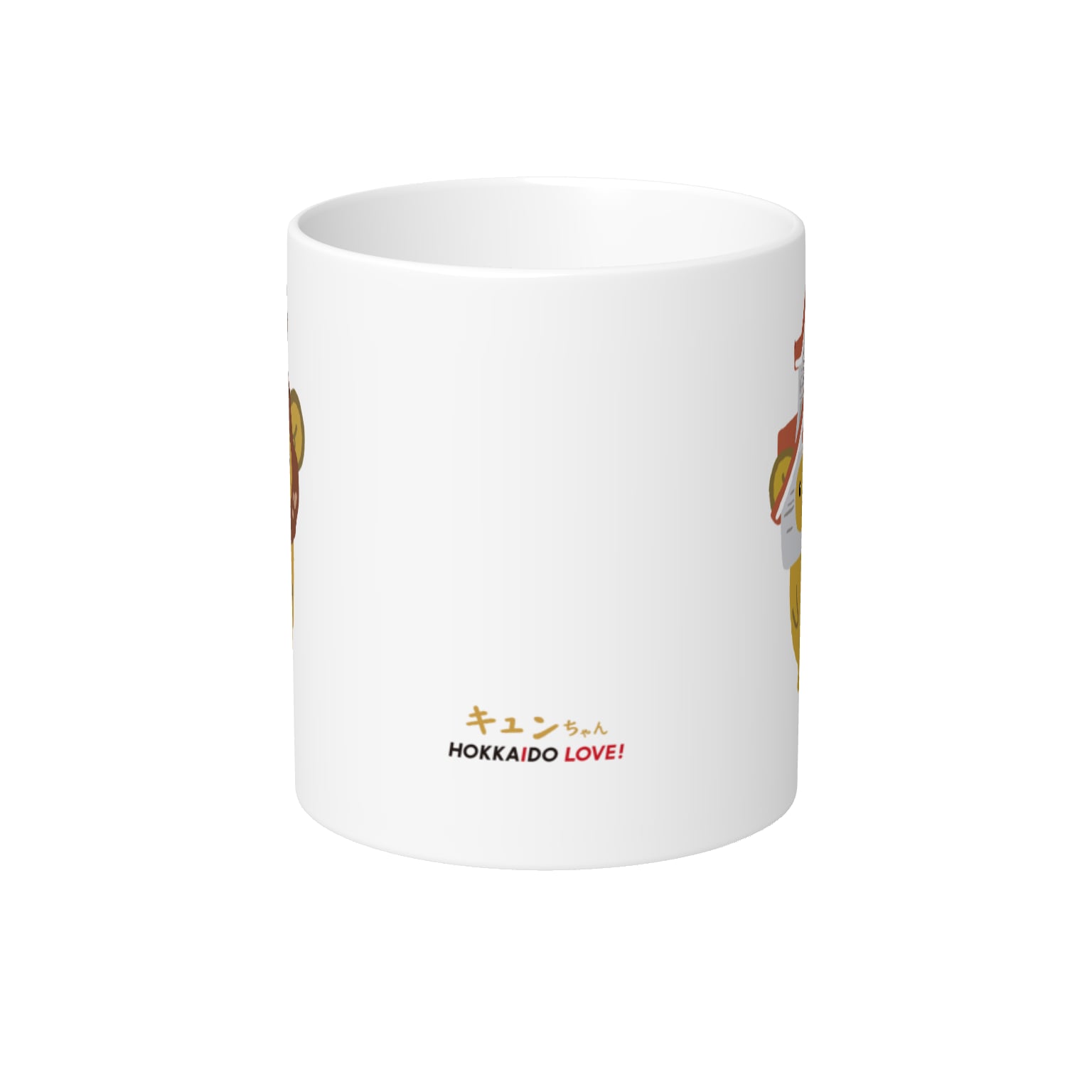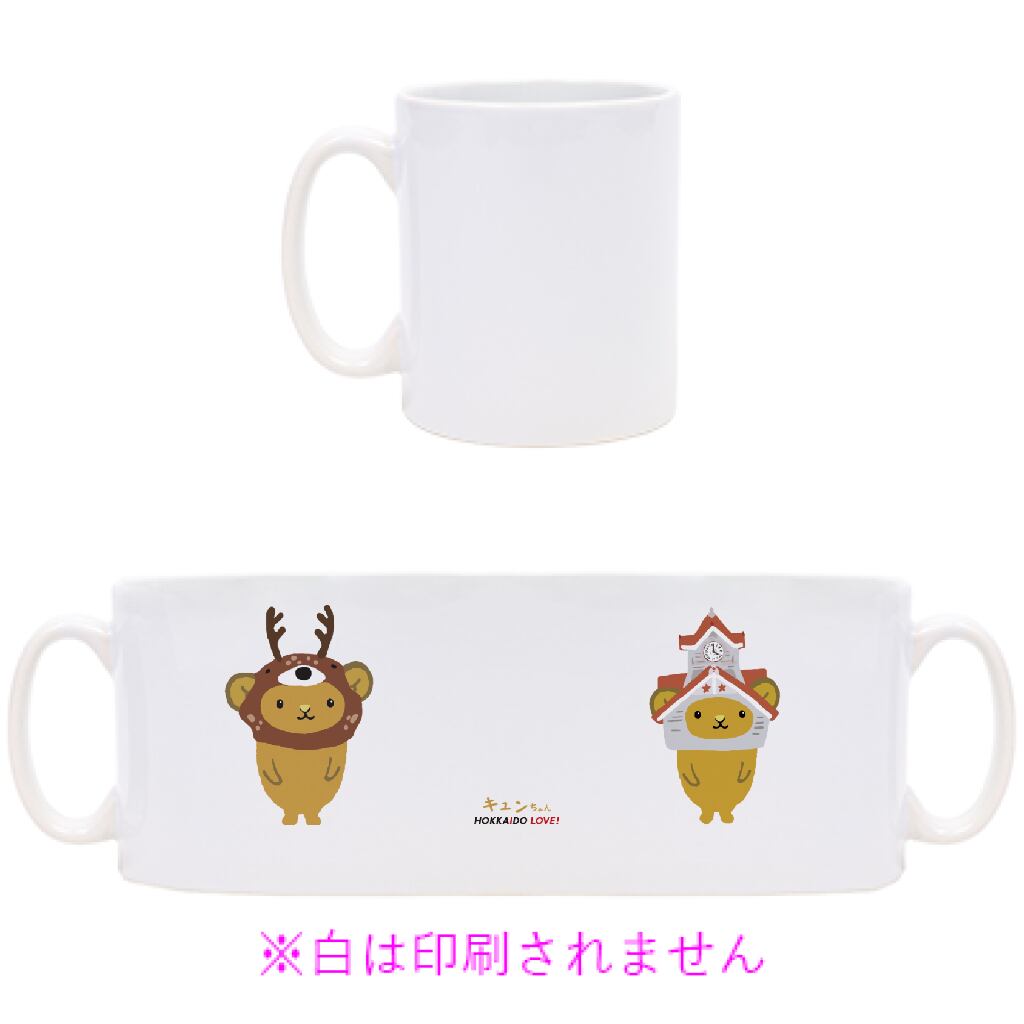 片面に時計台キュンちゃん、片面にスタンダードキュンちゃんがプリントされたマグカップです。側面にはキュンちゃん、HOKKAIDO LOVE!のロゴもプリントされています。