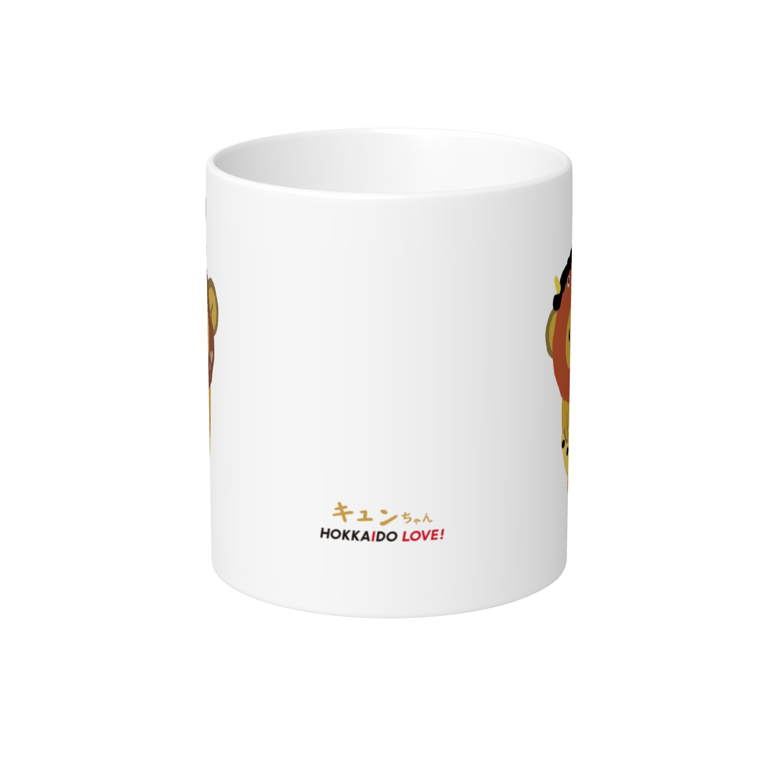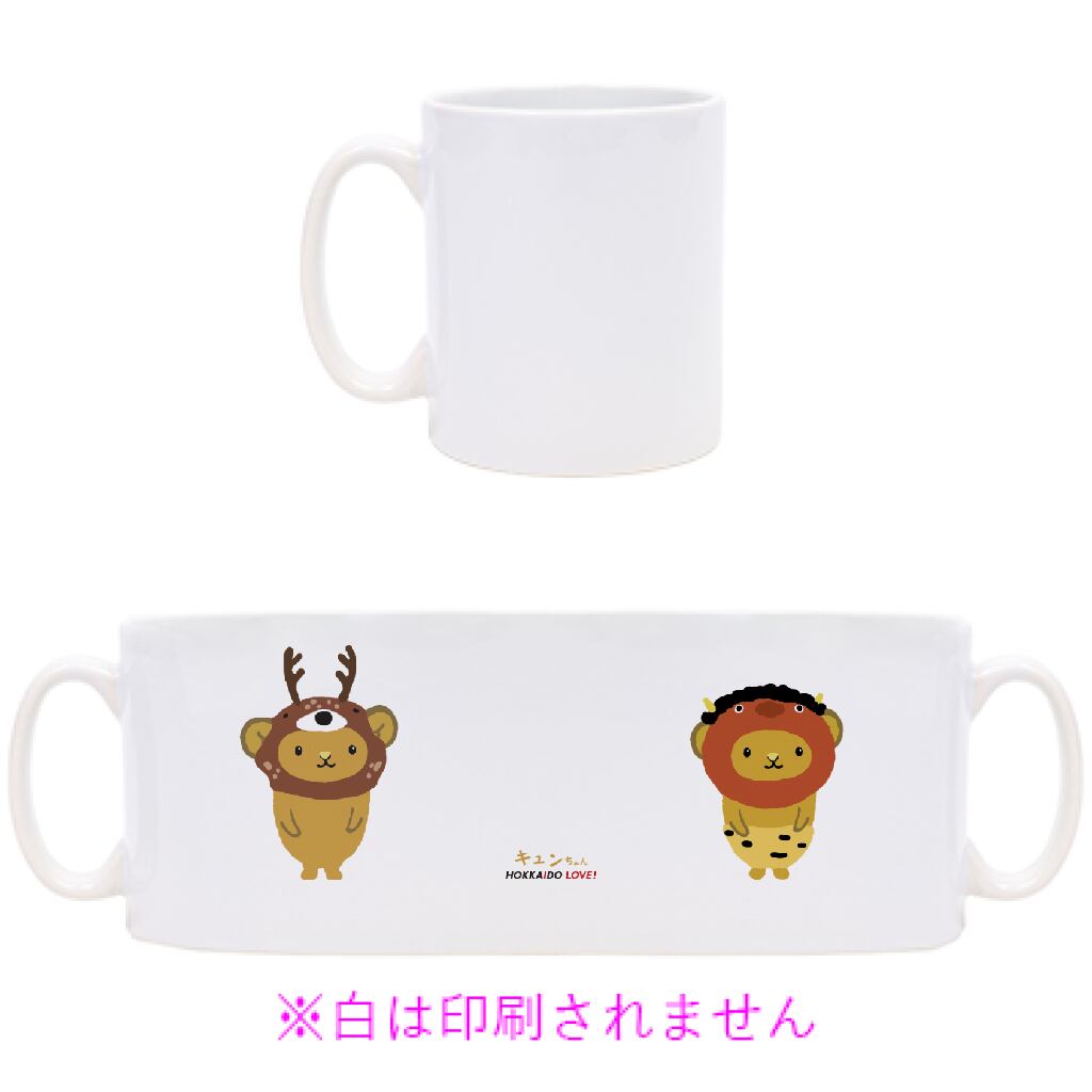 片面に鬼キュンちゃん、片面にスタンダードキュンちゃんがプリントされたマグカップです。側面にはキュンちゃん、HOKKAIDO LOVE!のロゴもプリントされています。