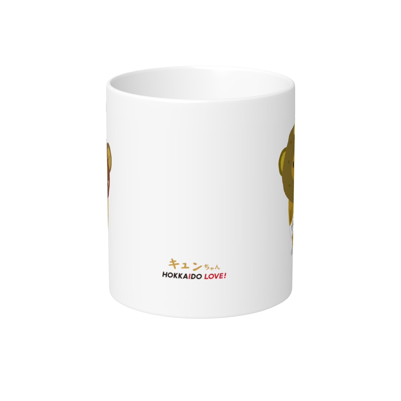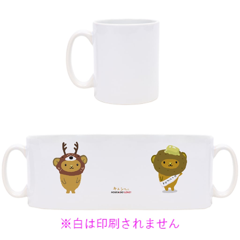 片面にじゃがばたキュンちゃん、片面にスタンダードキュンちゃんがプリントされたマグカップです。側面にはキュンちゃん、HOKKAIDO LOVE!のロゴもプリントされています。
