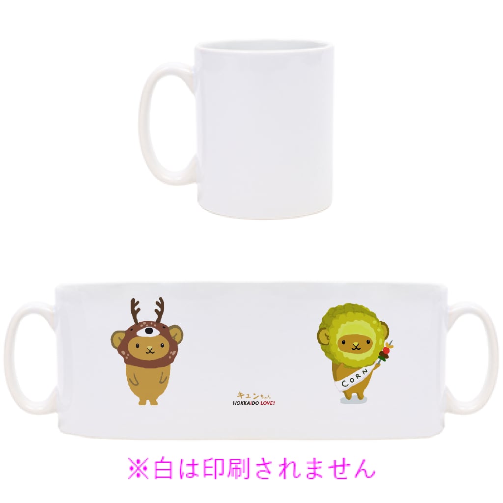片面にとうもろこしキュンちゃん、片面にスタンダードキュンちゃんがプリントされたマグカップです。側面にはキュンちゃん、HOKKAIDO LOVE!のロゴもプリントされています。